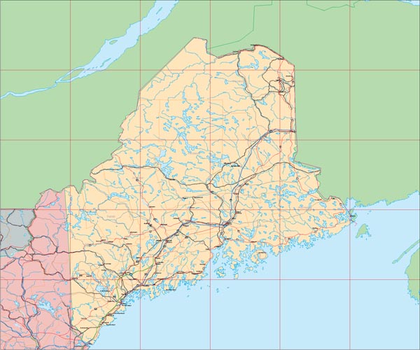 ![]() Detail view of EPS Vector Map of Maine - the land fill color is switched on. The EPS Vector map for Maine has 22 layers which may be individually modified or removed. Select the Vector only EPS map of Maine option to download this style map. |